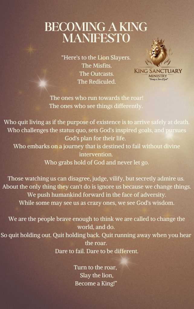 When God started to reveal this journey to me, He gave me this Becoming a King manifesto. The manifesto is a reminder for us, who we are in our new identity as sons of God; it’s something to hold on to, a motivation for what we are becoming, a king by God’s hand.